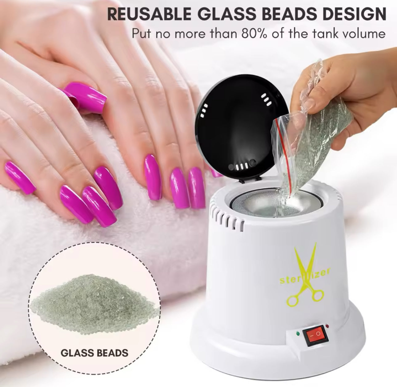 (Práctico esterilizador) El bote esterilizador puede esterilizar la mayoría de las herramientas de metal, como pinzas para uñas, pinzas, tijeras de corte de pelo y herramientas de pedicura, belleza de cejas, herramientas faciales y aguja.
