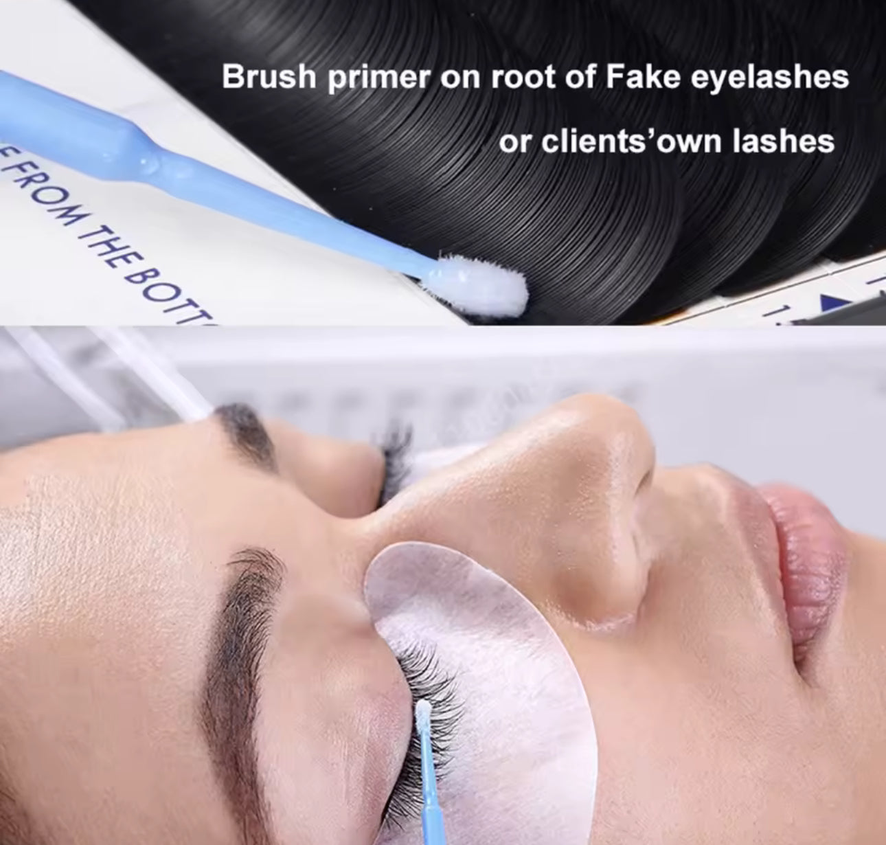 Rocíe la imprimación de pegamento en las raíces de Las pestañas postizas antes de usar el pegamento, después de aproximadamente 2-3 minutos, recoja las pestañas postizas sumergidas en el pegamento.